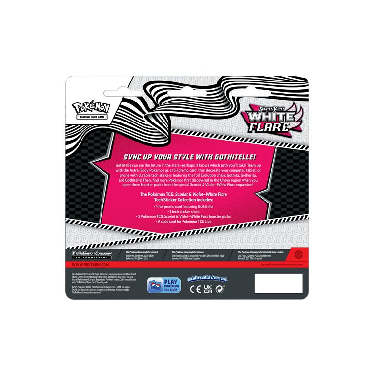 Breng je stijl naar het volgende niveau met de White Flare Tech Sticker Collection! Deze speciale set combineert verzamelplezier met creatieve accessoires voor je tech-gadgets. Met een schitterende promo-kaart, een exclusief stickervel en booster packs uit de White Flare uitbreiding is dit een must-have voor elke Pokémon-fan.